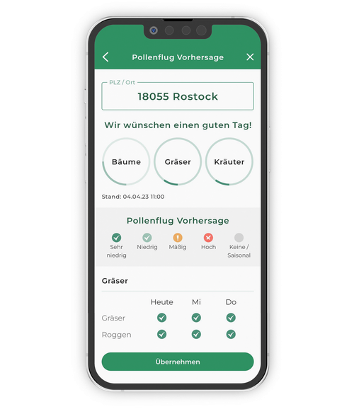 Welche Pollen fliegen heute? Die tagesaktuelle Pollenflug-Vorhersage zeigt in Ihrem Umkreis an, welche Pollen im Umlauf sind. Durch die einfache und schnelle Eingabe von der Postleitzahl werden Ihnen sofort die Pollen angezeigt.