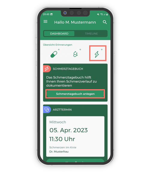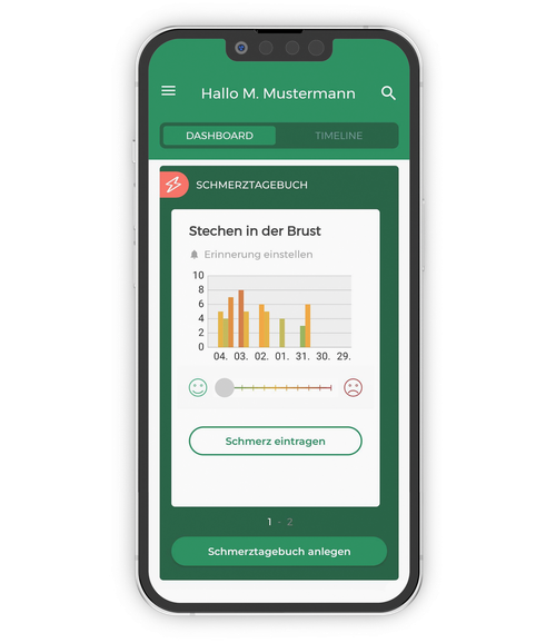 Auf dem Dashboard finden Sie den Reiter "Schmerztagebuch"