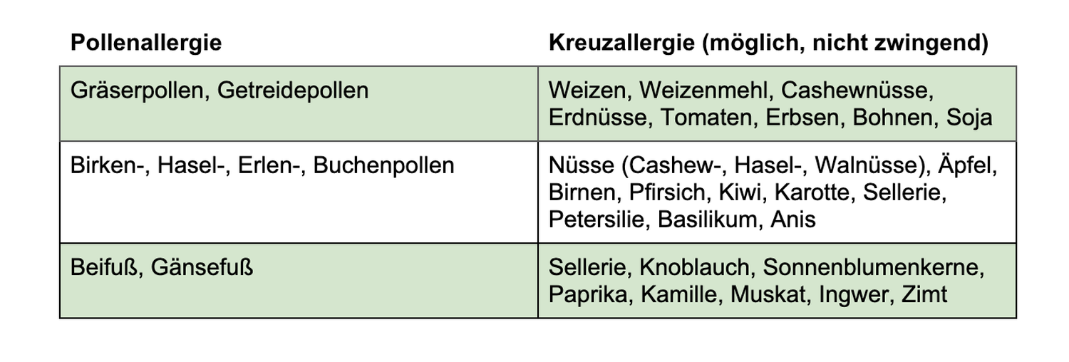 Weitere Beispiele für Kreuzallergien im Zusammenhang mit Heuschnupfen sind: